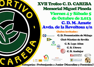 El CD Careba presenta nuevamente su torneo. El XVII Memorial Miguel Pineda se celebra con un nuevo formato: 12 horas de baloncesto de todas las categorías del Club, pero todo en el mismo día, disputándose desde las 9.00 a 21.00 horas de forma ininterrumpida en las tres pitas del CDM Amate. La cita será mañana con más de 500 jugadores de todas las categorías. Además del CD Careba, se unirán a esta fiesta, por vez primera, clubes de fuera de la provincia. Así, estarán la Sociedad Deportiva La Presentación de Málaga, el CB Lepe Alius Huelva, el CB Andújar y los sevillanos Club Náutico y CB Utrera. El cuadrante de los partidos sería muy largo de reseñar, pero aquí pueden consultarlo por si quieren pasarse a algún partido.